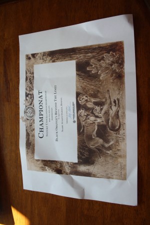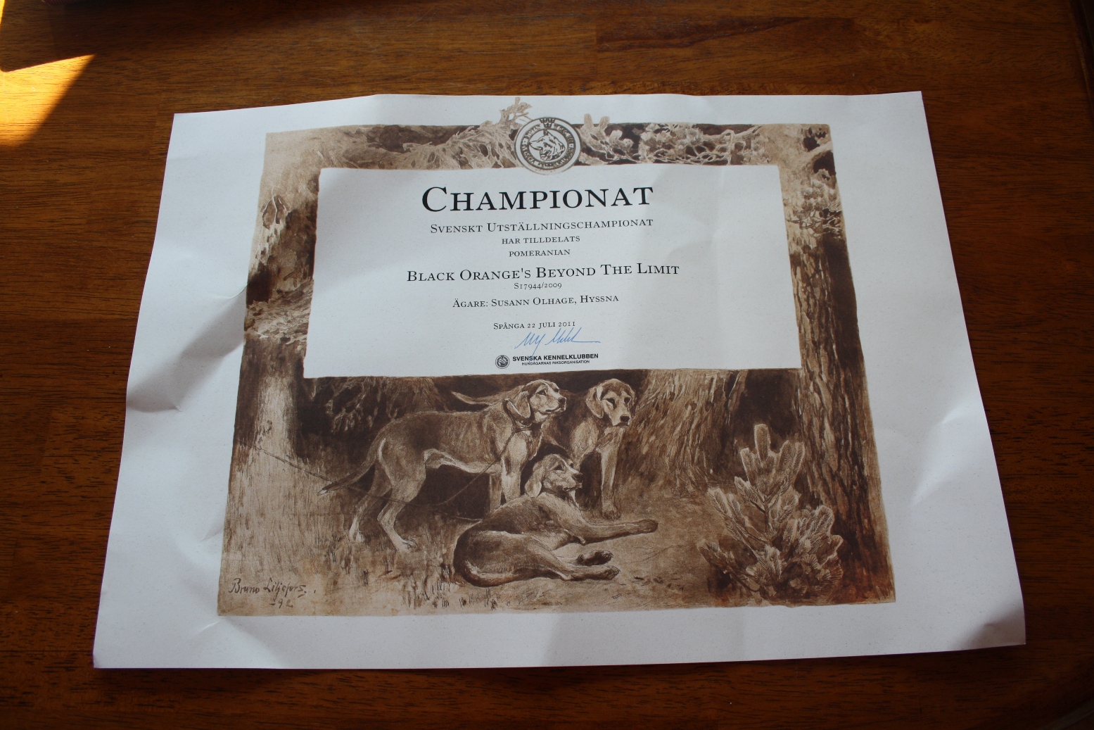 Jag blev smått irriterad för ett tag sedan då jag hämtade ut ett Nordiskt championatsdiplom. De svenska är ju fina och stora. Jag betalade över 300 kronor för ett litet fult diplom i A4. Så dåligt av kennelklubben. Man lägger så mycket pengar på att få fram en champion och ännu mer på en nordisk eller internationell. För mig är det självklart att kennelklubben ska skänka diplomen…