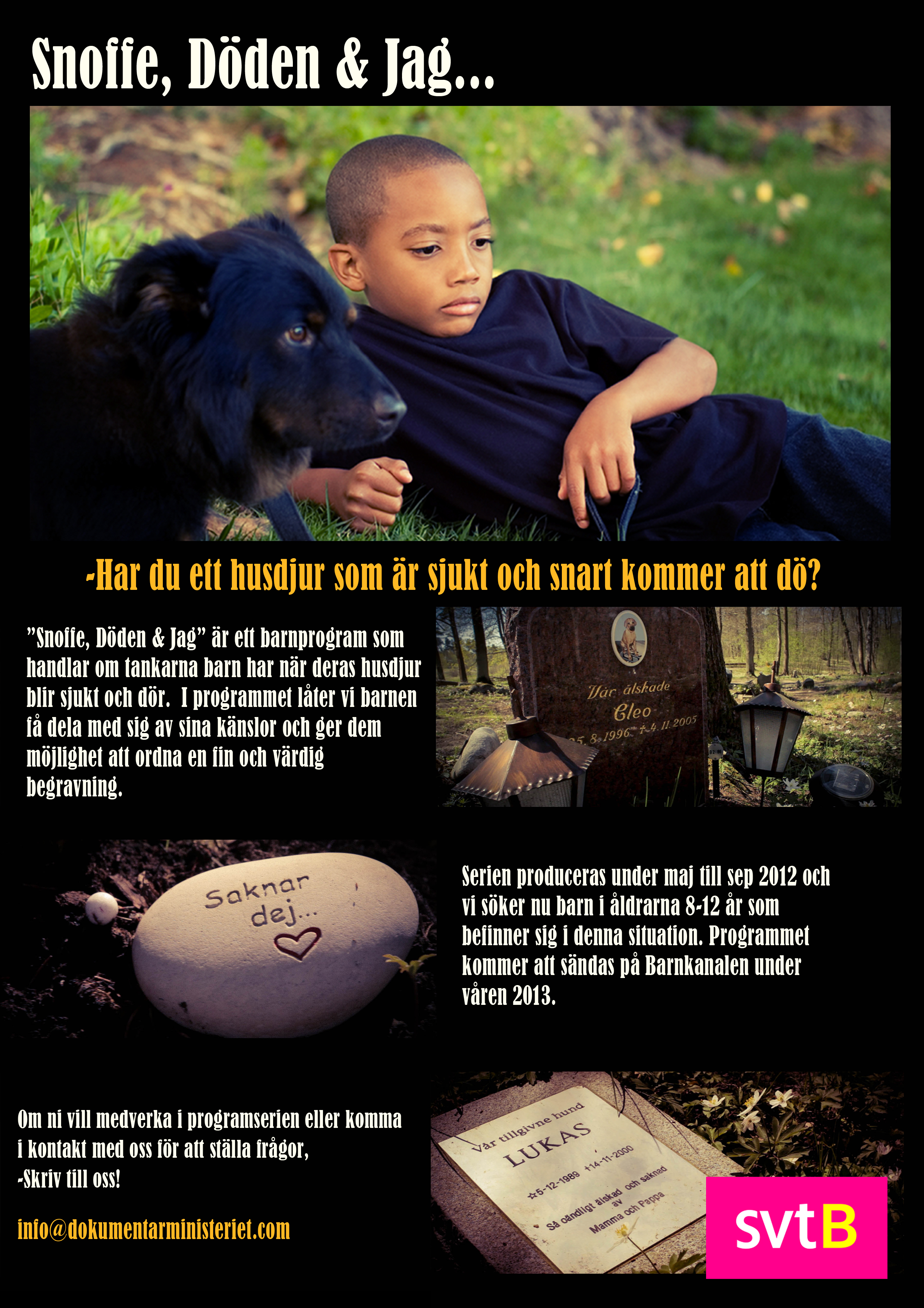 Om ni vill medverka i programserien eller komma i kontakt med SVT för att ställa frågor – skriv till SVT! info@dokumentarministeriet.com