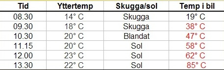Efter ca 28 min i en bil placerad i skuggan med yttertemp 25 °C kan det vara 49 °C inne i bilen.