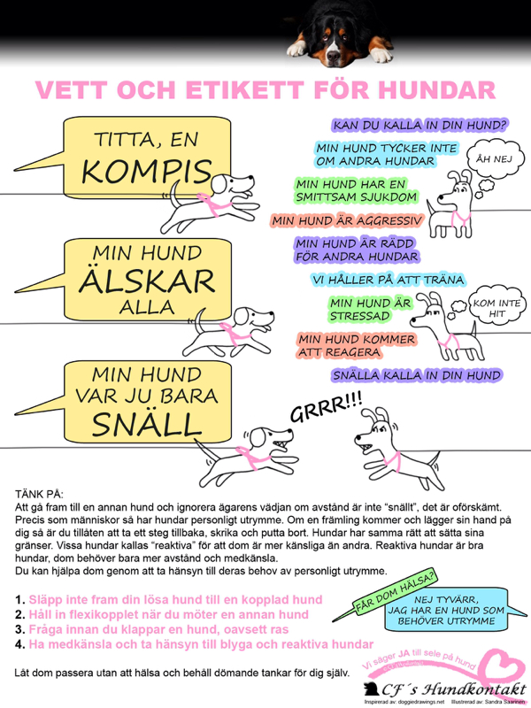 Även i Svenska kennelklubbens kampanj Skäll inte på hunden står det Visa hänsyn mot andra hundar! Respektera att alla hundar varken vill eller ska hälsa på varandra!