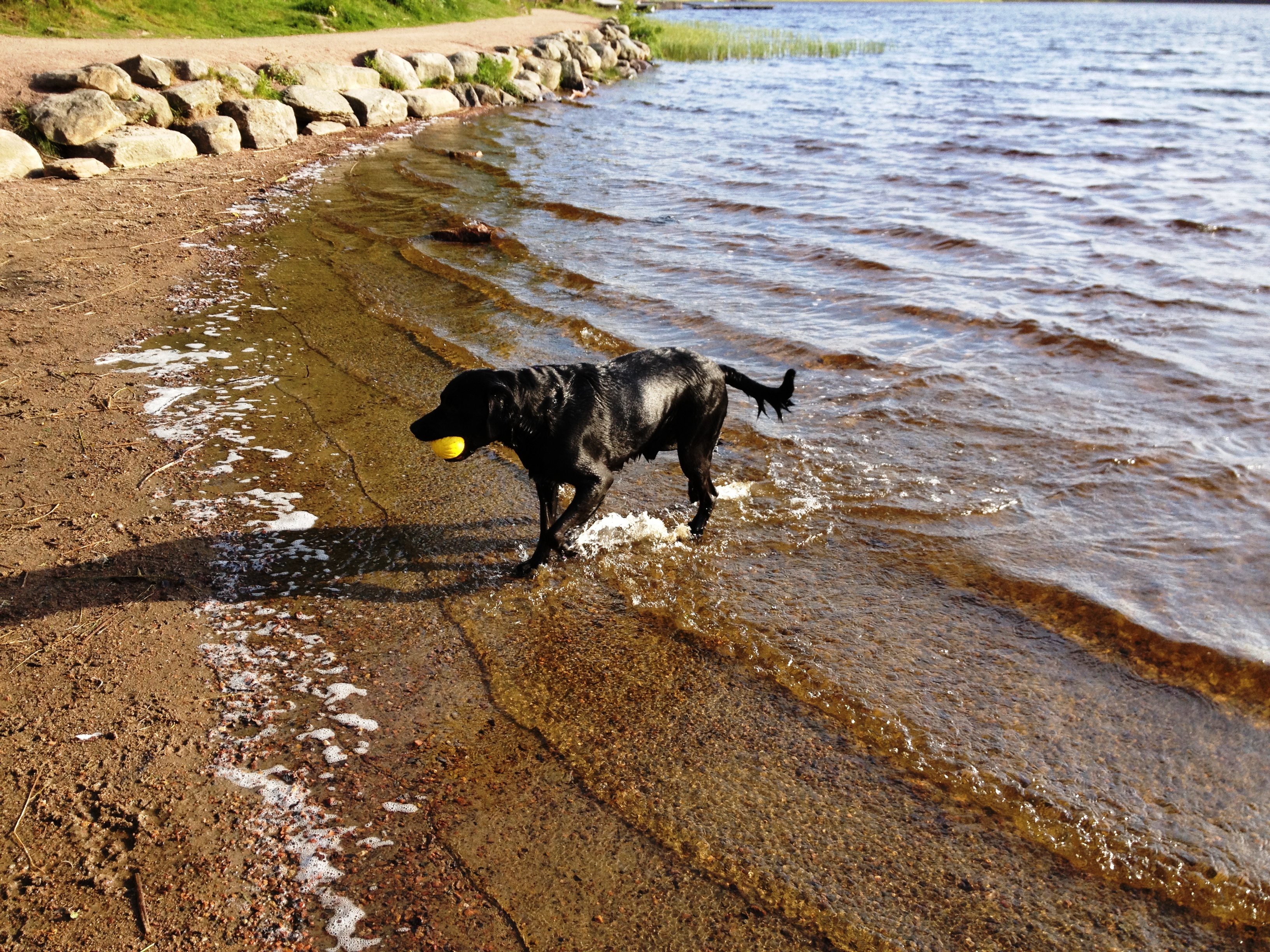 Jag hade en konstant snygg blå rand på baksidan av låren i form av ett blåmärke. Väl i skogen kändes det nog lika tillfredsställande för mig som det var för honom att få springa omkring lös och bara få vara hund. Han var utom sig av glädje varje gång som jag dök upp för att hämta honom. Jag blev synonym med skogen för honom. Eftersom det var sommar så passade vi även på att ta ett dopp i Härlanda tjärn. Han tröttnade aldrig på att simma efter bollar.