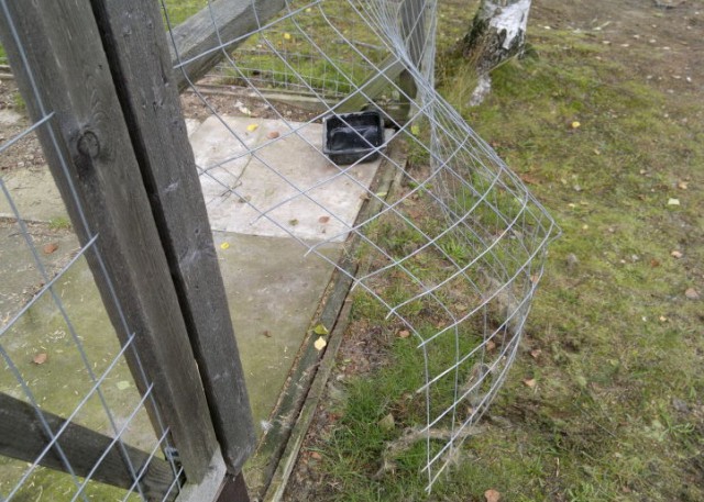 eftersom gitteret bøjer ud, er det mere troligt at hunden er brudt ud, og derefter er blevet offer for en varg