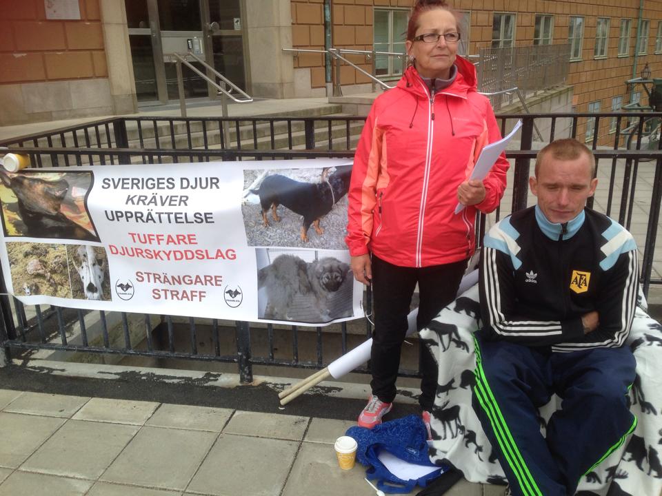 Bakgrunden är den skrivelse och den namninsamling vi gick ut med på fb i förra veckan. Vi stod utanför Riksdagshuset och delade ut den. 4 stora banderoller satt uppsatt i broräcket. Ett flertal regeringsmedlemmar tog emot skrivelsen då de gick till/från sin lunch. Men ingen stannade till för att prata. Det gjorde däremot flera privatpersoner som även de anser att straff för Djurskyddsbrott inte står i relation till brottet. Även människor från vårt grannland Norge stannade till och de visste naturligtvis om den uppmärksamhet som var där vid rättegången mot ”Norskan” år 2010