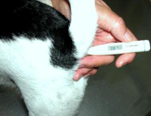 - Ta hem hunden, ta temp, då du alltid skall ha gjort tidigare då hunden är i vila så att du vet vilken temp din hund normalt skall ha. Har den hög temp, över 39 C så är den för hög, tempen på en hund kan normalt variera mellan 38-39 C.