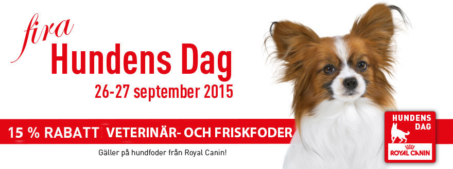 För att fira hundens dag (den 25-27 sept) sänker Vetzoo.se priset på Royal Canins hundfoder (frisk- och veterinärfoder) med 15%.