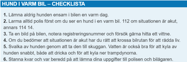 Nu är sommarvärmen här i hela landet och man ser tyvärr att hundägare lämnar sina hundar i bilen då de uträttar ärenden – här kommer lista på vad du får göra om du ser en hund som mår dåligt i en bil.