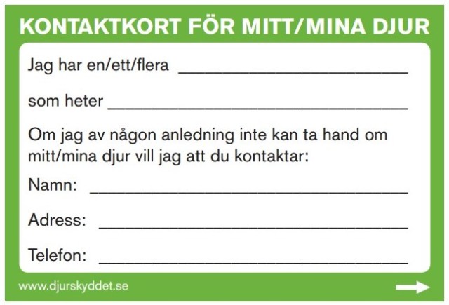 Alla djurägare borde ha ett kontaktkort att förvara i plånboken och hemma, på insidan av ytterdörren: ”Om något händer mig så ansvarar han eller hon för mitt djur”.