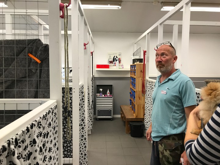 Pelle visar runt på hunddagiset som var fräscht och ljust – där bodde just nu tre hundar på pensionatssidan, alla hundar mycket lugna vi hörde inte ett enda skall under vårt besök.