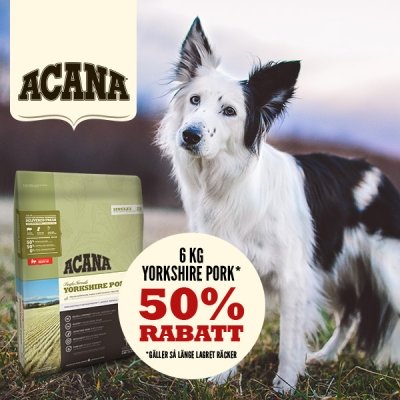 50 % rabatt på 6 kg Yorkshire Pork Acana hundfoder så länge lagret räcker