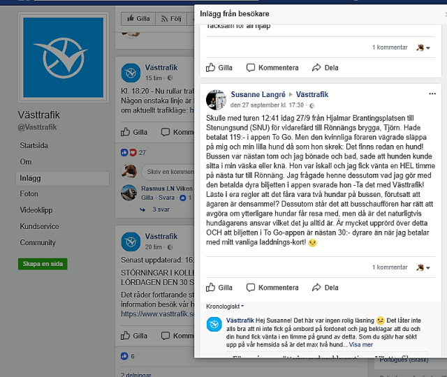 Susanne skriver till oss och på Västtrafiks sida: blev avvisad idag (27/9-17) med min lilla hund Hjalmar Brantingsplatsen till Stenungsund (SNU) för vidarefärd till Rönnängs brygga, Tjörn. Hade betalat 119:- i appen To Go. Men den kvinnliga föraren vägrade släppa på oss, hon skrek: Det finns redan en hund! Bussen var nästan tom (syntes ingen hund) och jag bönade och bad, sade att hunden kunde sitta i min väska eller knä. Hon var iskall och jag fick vänta en HEL timme på nästa tur till Rönnäng. Jag frågade henne dessutom vad jag gör med den betalda dyra biljetten i appen viftade hon bara med handen -Ta det med Västtrafik!