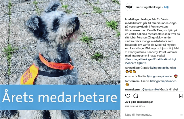 Landstinget Blekinge skriver på sin instagram : Pris för ”Årets medarbetare” går till terapihunden Zingo på vuxenpsykiatrin i Ronneby.
