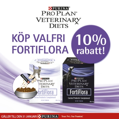 10 % rabatt pĂ„ valfri FortiFlora – otroligt bra för magen, vi ger alla vĂ„ra hundar en pĂ„se FortiFlora dagligen.