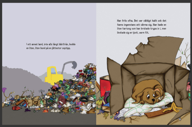 I ett annat land, inte alls långt härifrån, bodde det en liten, liten hund på en jättestor soptipp. Han var ensam, hungrig och frös ofta. En dag kom en man till soptippen, en främling, precis en sådan hans mamma hade varnat honom för. Vad skulle hända nu?