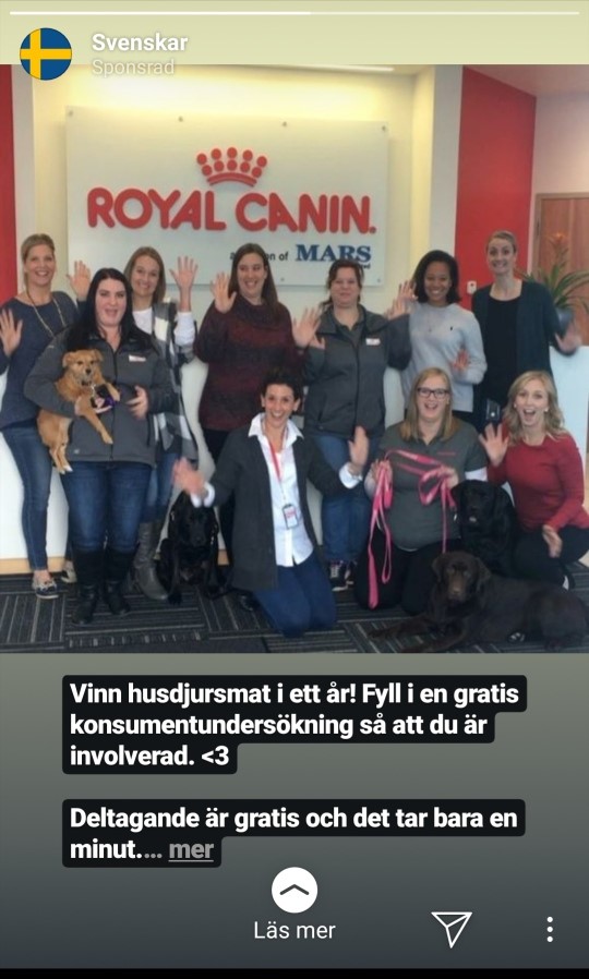 Vi svarade på tävlingen ovan som är sponsrad och ligger ute på instagram, där det framgår att man deltar i en gratis konsumentundersökning och kan vinna husdjursmat för 1 år. Man tror av bilden att det är Royal Canin som ligger bakom tävlingen?