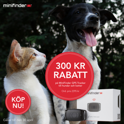 300 kr rabatt på MiniFinder GPS Tracker till hundar och katter. MiniFinder är en billig livförsäkring om din hund skulle springa bort, då kan du enkel se var den befinner sig.