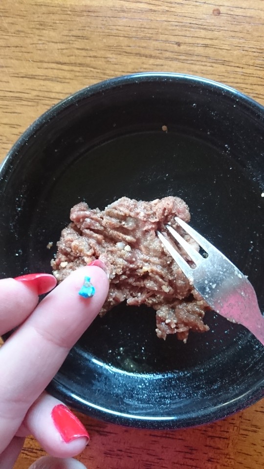 Vi brukar inte mosa köttbullarna med gaffel men idag tillsatte vi mjölksyrebakterier och mosade samman allt till en gröt. Plötsligt kände jag något hårt med gaffeln och fick syn på en vass blå plastbit.