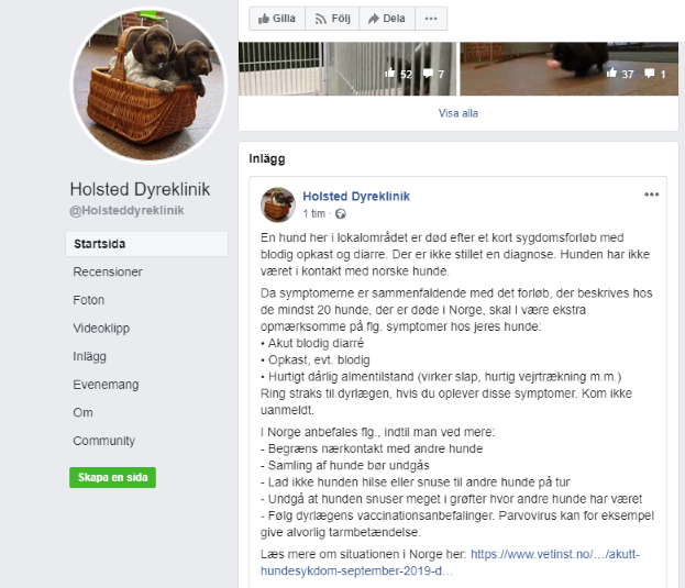 Holsted Dyreklinik skriver på sin facebooksida: En hund här i lokalområdet har dött efter ett kort sjukdomsförlopp med blodig kräkningar och diarré. Ingen diagnos har ställts. Hunden har inte haft kontakt med norska hundar.