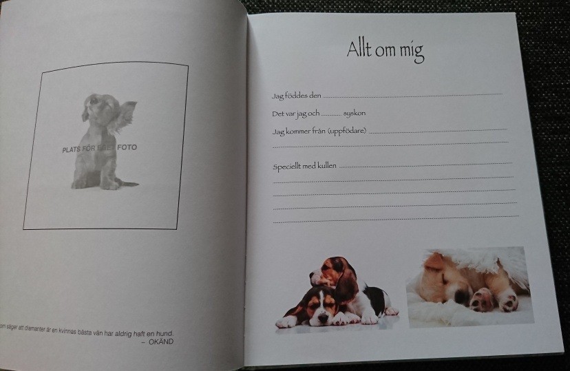 Boken kommer att bli som ett perfekt minne av din hund, en bok som du själv fyller i och som du alltid kan titta tillbaka i och se hur din hunds liv var som valp.