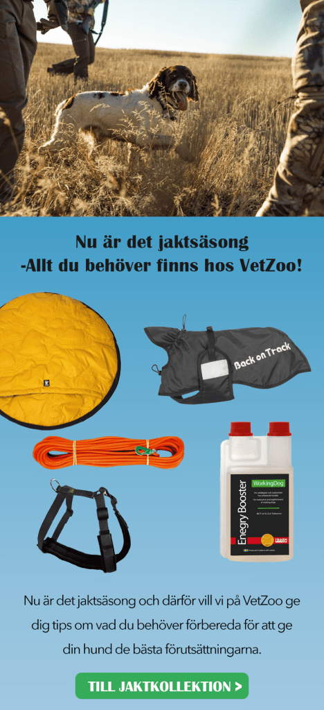 - Byt till ett foder med högre energiinnehåll: I takt med att hunden börjar tränas inför jakten är det viktigt att se över energimängden i fodret så att den får i sig tillräckligt med energi. Ganska ofta får vi frågan om man inte bara kan öka storleken på portionen. Det kan man, men får hunden alltför stora portioner får magen arbeta lite för mycket och det i sin tur kan leda till magstörningar. Byt i stället i god tid till ett foder med högre fetthalt under jaktsäsong, då blir portionerna väl anpassade för din hunds arbetsinsats. Tänk på att långsamt fasa in fodret så kroppen vänjer sig och kan tillgodogöra sig fettet optimalt. Till foder >>