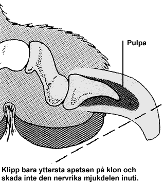 Viktigast är att inte klippa i hundens pulpa. På hundar med ljusa klor så är det ganska lätt att se vart pulpan är, på hundar som har mörkare klor så kan det vara svårare att se men genom att lysa med en lampa så kan man lättare se pulpan även på mörkare klor.