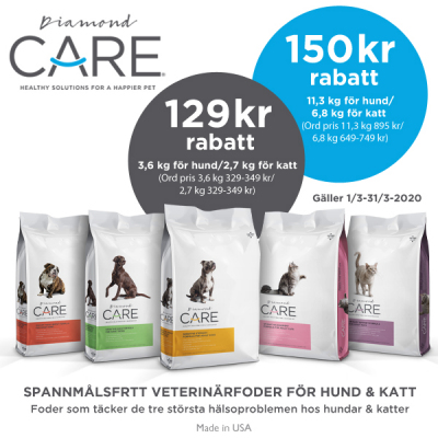 Med hjälp av Diamond Cares olika produkter kan vi alltså få våra älskade hundar och katter att må sitt bästa. Till HUND finns foder för viktnedgång, magproblem, hudproblem och njurproblem. Till KATT finns foder för viktnedgång och urinsten (struvit).
