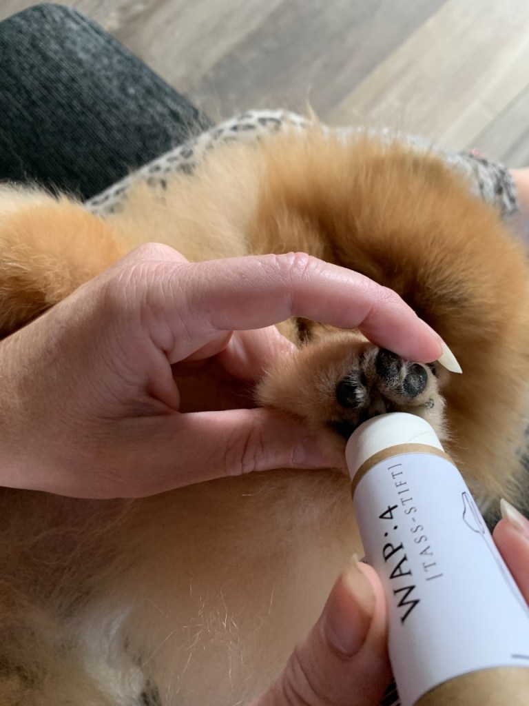 Efter badet smörjde vi in hundens alla tassar med WAP:4 tass-stift, som skyddar, vårdar och återfuktar trampdynorna och som förhindrar sprickor. Trampdynorna blir supermjuka av denna produkt, absolut något som vi kommer att fortsätta använda till alla våra hundar.