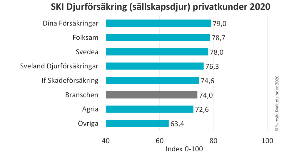 Högst kundbetyg får Dina Försäkringar samt Folksam. Lägst betyg får kategorin ”Övriga”, dvs mindre aktörer med liten marknadsandel och få respondenter i denna studie. En viss skillnad finns mellan katt- och hundägare, där kattägare överlag är något mer nöjda.