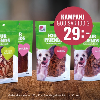 Four Friends erbjuder ett brett sortiment av smaskigt godis som går hem även hos de mest kräsna hundarna.