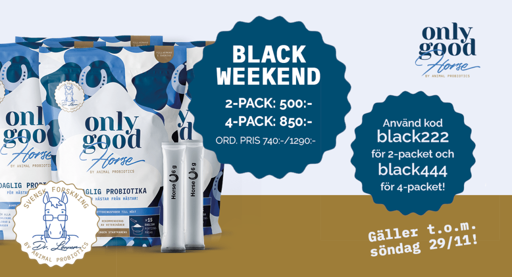 OnlyGoodHorse Black Weekend – 2-pack: 500 kr, 4-pack 850 kr (ord. pris 740:- / 1290:- Använd kod black222 för 2-packet och kod black444 för 4-packet i kassan hos Animal Probiotics på länken HÄR!