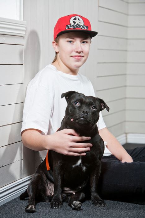 Glädjespridaren Cocos, en sexårig staffordshire bullterriertik, tog emot utmärkelsen Årets sociala tjänstehund med ett brett staffe-leende, som sig bör. Hon och hennes matte får därmed motta Agria Djurförsäkrings årliga bidrag till kategorin Året sociala tjänstehund.