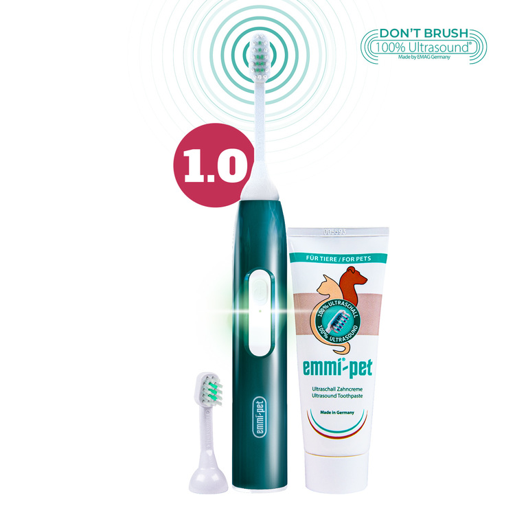 Med Emmi-pet rengör du tänderna utan vibrering, utan borstning och helt ljudlöst, du håller enbart tandborsten lätt mot tanden och tänderna rengörs från tandsten genom ultraljud. Du använder Emmi-pets tandpasta och det ger inget obehag för hunden. Våra hundar är inte vana vid tandborstning men detta fixar de.