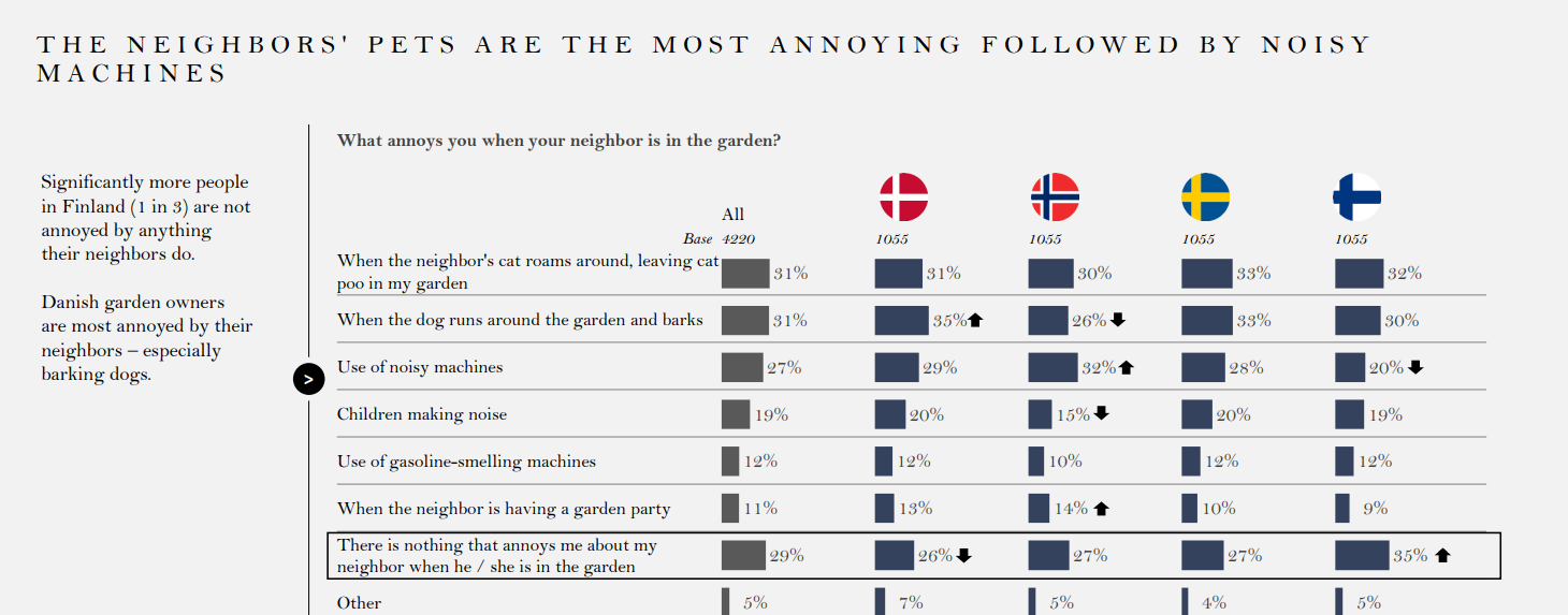 Undersökningen visar att 33 procent av svenskarna anser att det mest störande som finns är då grannens hund springer runt och leker och skäller i trädgården. Hela 7 procent av svenskarna har bråkat med sin granne om att deras hund skäller i trädgården eller att hunden eller katten har bajsat i deras trädgård.