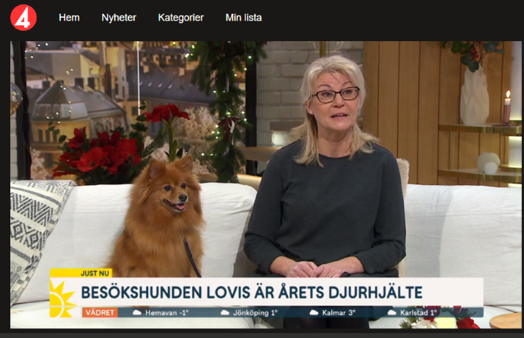 På fredag sänds Aftonbladets Svenska hjältar-gala i TV4, där sex vardagshjältar av flera hundra har blivit utvalda av en jury för sina insatser. Hunden Lovis är utbildad besökshund som besöker personer som bor på äldreboenden. Hon prisas för sina insatser där hon ger stöd och sällskap till äldre, skriver TV4play på sin sida.