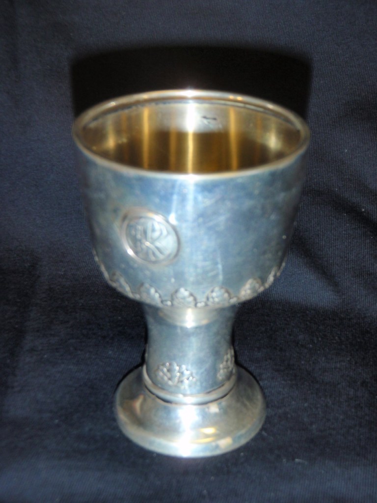 Pokalen på bilden är 9 cm hög och har på framsidan ett monogram där man kan uttyda bokstäverna SKK som står för Svenska kennelklubben. Pokalen har dekorationsslingor med ekblad och silverstämplar i botten.