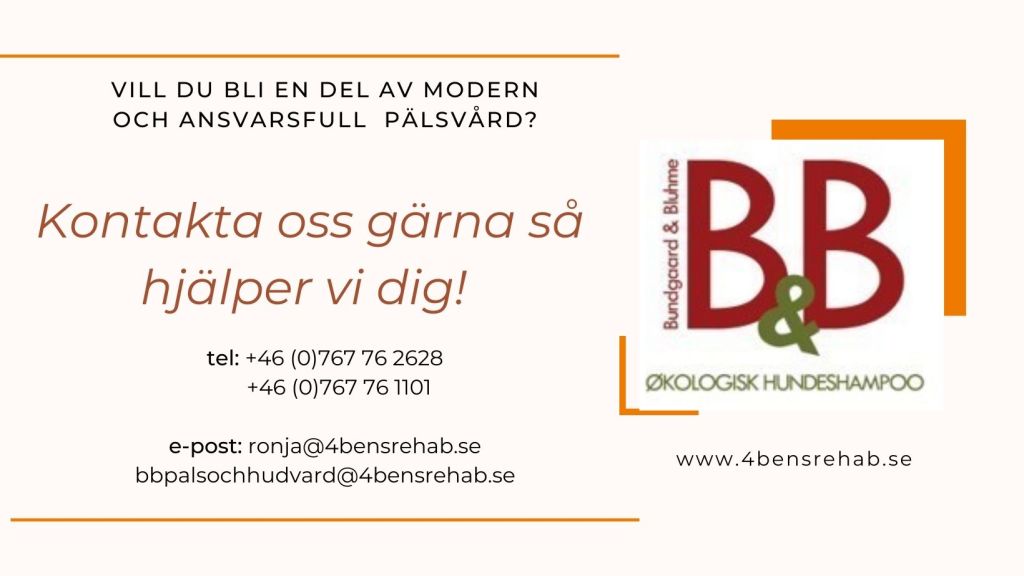 Har du butik och vill du bli återförsäljare är du välkommen att kontakta Ronja Oldin, Pälsvårdskonsulent, 4bens Rehab, Tel. +46 (0)767762628 eller ronja@4bensrehab.se eller Tel. +46 (0)767761101, bbpalsochhudvard@4bensrehab.se