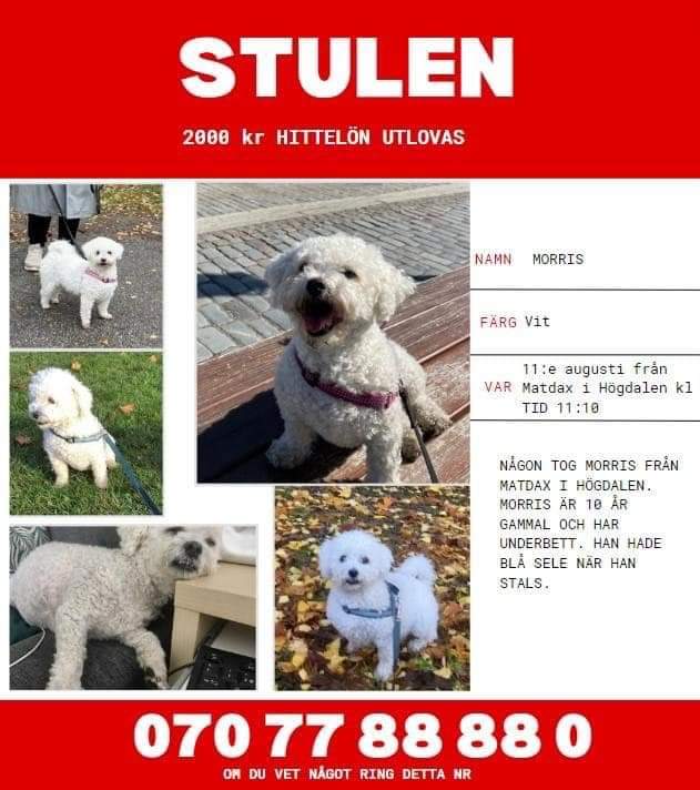 Hund stulen utanför Matdax i Högdalen. Hunden Morris är 10 år gammal och stals utanför affären idag den 11 augusti kl 11 tiden. Hunden hade en blå sele på sig.