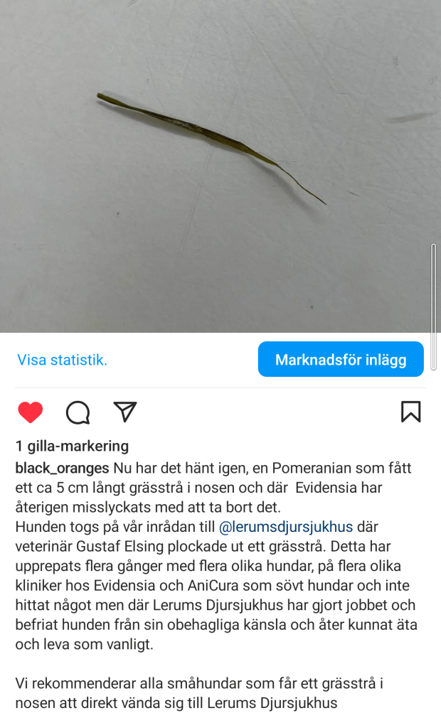”En dvärghund togs till veterinär med misstänkt grässtrå i svalget/nosen, hunden hade svåra besvär och ägaren talade om att hen misstänkte grässtrå i nosen. Två oberoende av varandra veterinärkliniker missade grässtråt och hunden behandlades med bla antibiotika, rimadyl och kortison för olika misstänkta åkommor.”En dvärghund togs till veterinär med misstänkt grässtrå i svalget/nosen, hunden hade svåra besvär och ägaren talade om att hen misstänkte grässtrå i nosen. Två oberoende av varandra veterinärkliniker missade grässtråt och hunden behandlades med bla antibiotika, rimadyl och kortison för olika misstänkta åkommor”, skrev vi tidigare där både Evidensia och AniCura gjorde feldiagnoser på en hund som knappt kunde äta eller dricka själv utan matades med en spruta.