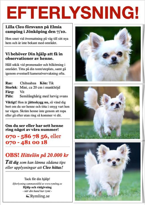 EFTERLYSNING – CHIHUAHUA HUNDEN CLEO FÖRSVANN PÅ ELMIA CAMPING I JÖNKÖPING DEN 7 OKTOBER – ALLA EVENTUELLA LEDTRÅDAR OBSERVATIONER ÄR VIKTIGA!
