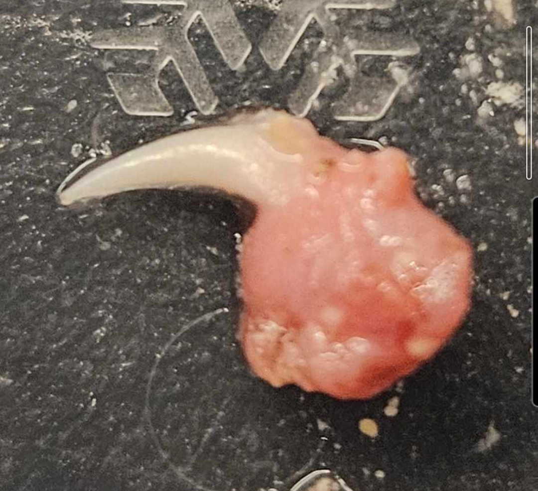 Klo eller tand hittad i färskfoder för hundar Mush Hellä Nöt från Finland? Enligt hundägaren som hittade denna motbjudande 8 mm (den vita delen) stora del från ett djur, så är det en mjuk del så tveksamt om det är en tand, kanske en klo från ett mindre djur som katt?