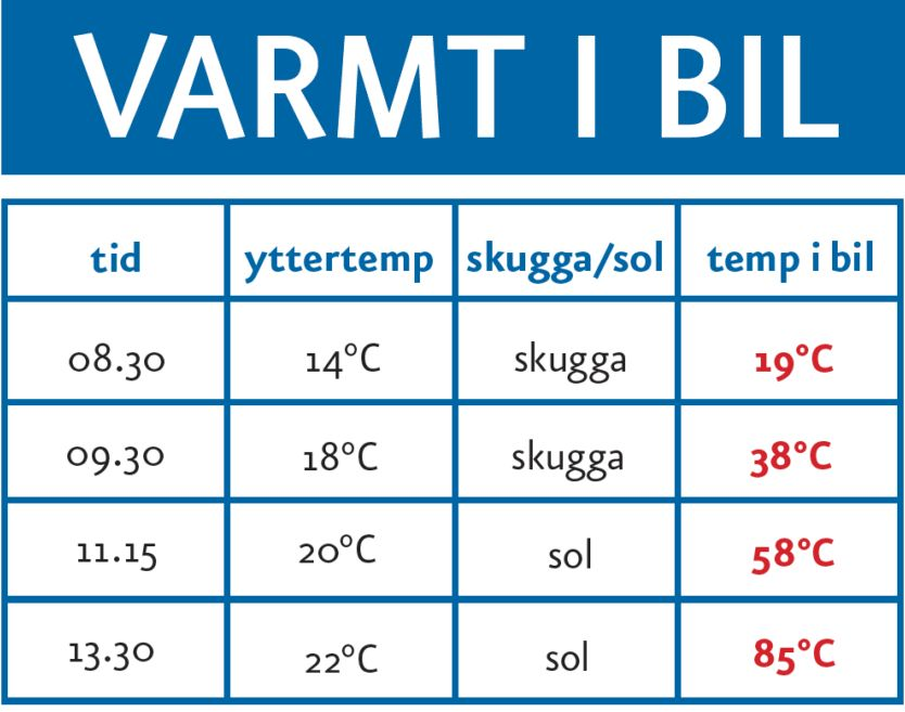 En svensk sommardag ökar värmen i din bil dramatiskt. På några timmar kan temperaturen stiga från 20 till 85 grader om fönster och dörrar är stängda. Bilen blir livsfarlig – en kvarlämnad hund kan dö av värmeslag på bara tjugo minuter. Här kan du se hur mycket varmare än yttertemperaturen som det kan bli i din bil: