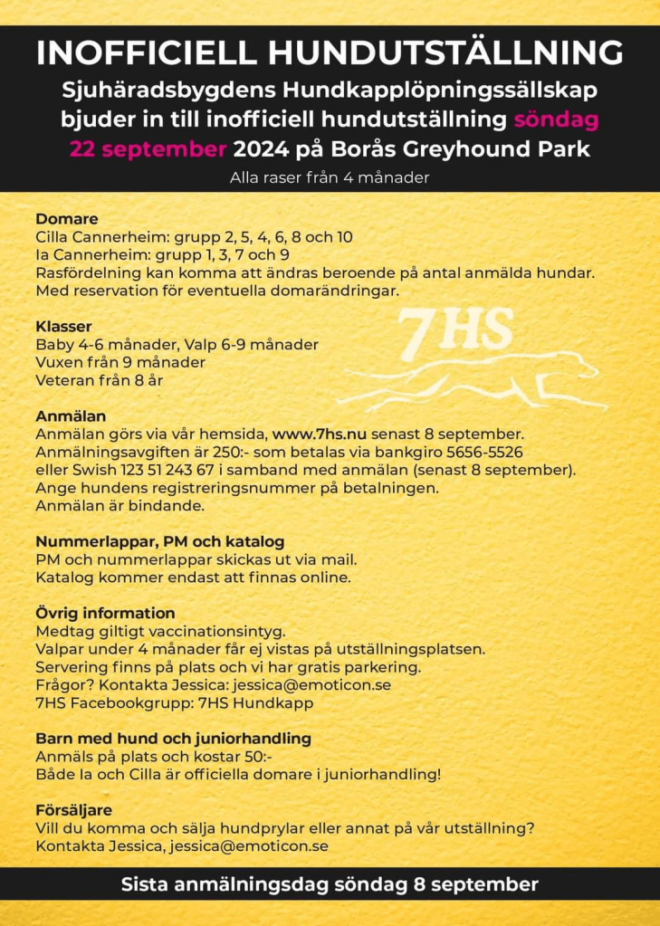 Inofficiell hundutställning 22 september 2024 på Borås Greyhound Park – alla raser från 4 månader