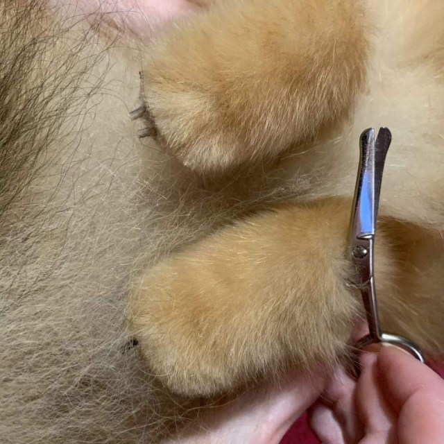 Börja sedan trimningen med att klippa klorna så korta som möjligt, detta görs bäst genom att hunden ligger på rygg i ditt knä. Då klorna är klippta så tar du en liten stålkam och kammar tasshåren mothårs uppåt/bakåt (hunden ligger fortfarande i din famn på rygg). Klipp sedan med en liten sax med böjd topp de hår som ”sticker” ut det vill säga klipp runt tassen så att tassen får en mjuk rund linje som en kattass. Klipp även bort allt hår mellan trampdynorna under tassen. Fortsätt så på alla fyra tassar. På baktassarna kammar man håren på ”hälen” mothårs och klipper av topparna så att pälsen ”orkar stå upp”. Nu är du klar med hundens tassar. Saxen med böjd topp hittar du hos Dashing Dogs här