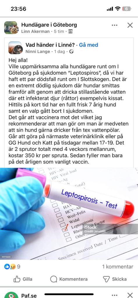 Ville uppmärksamma alla hundägare runt om I Göteborg på sjukdomen “Leptospiros”, då vi har haft ett par dödsfall runt om i Slottskogen. Det är en extremt dödlig sjukdom där hundar smittas framför allt genom att dricka stillastående vatten där ett infekterat djur (råttor) exempelvis kissat. Hittills på kort tid har en fullt frisk 7 årig hund samt en valp gått bort i sjukdomen, skriver Ninni Lange den 1 oktober 2024 i gruppen Vad händer i Linné på facebook.