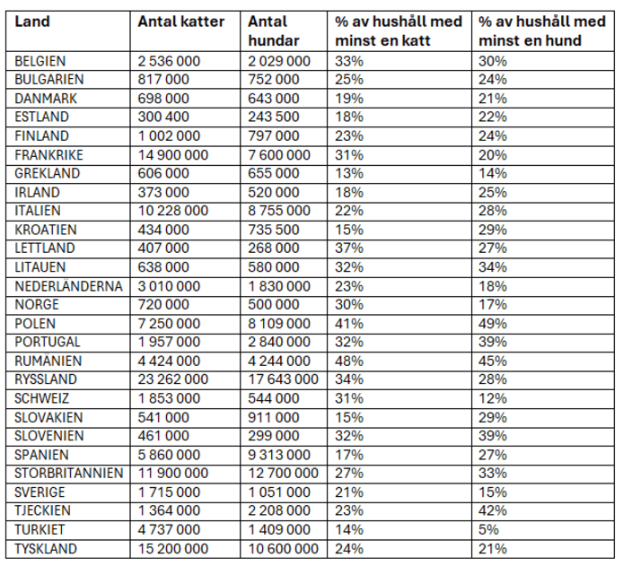 Land Antal katter Antal hundar % av hushåll med minst en katt % av hushåll med minst en hund