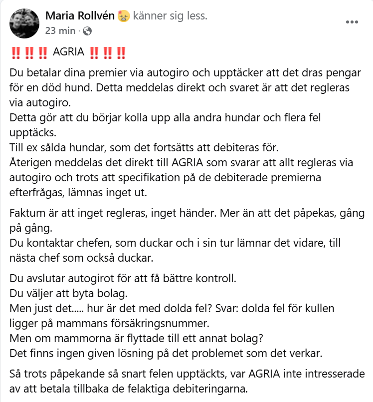 Maria Rollvén kund hos Agria skriver på facbook: Du betalar dina premier via autogiro och upptäcker att det dras pengar för en död hund. Detta meddelas direkt och svaret är att det regleras via autogiro.