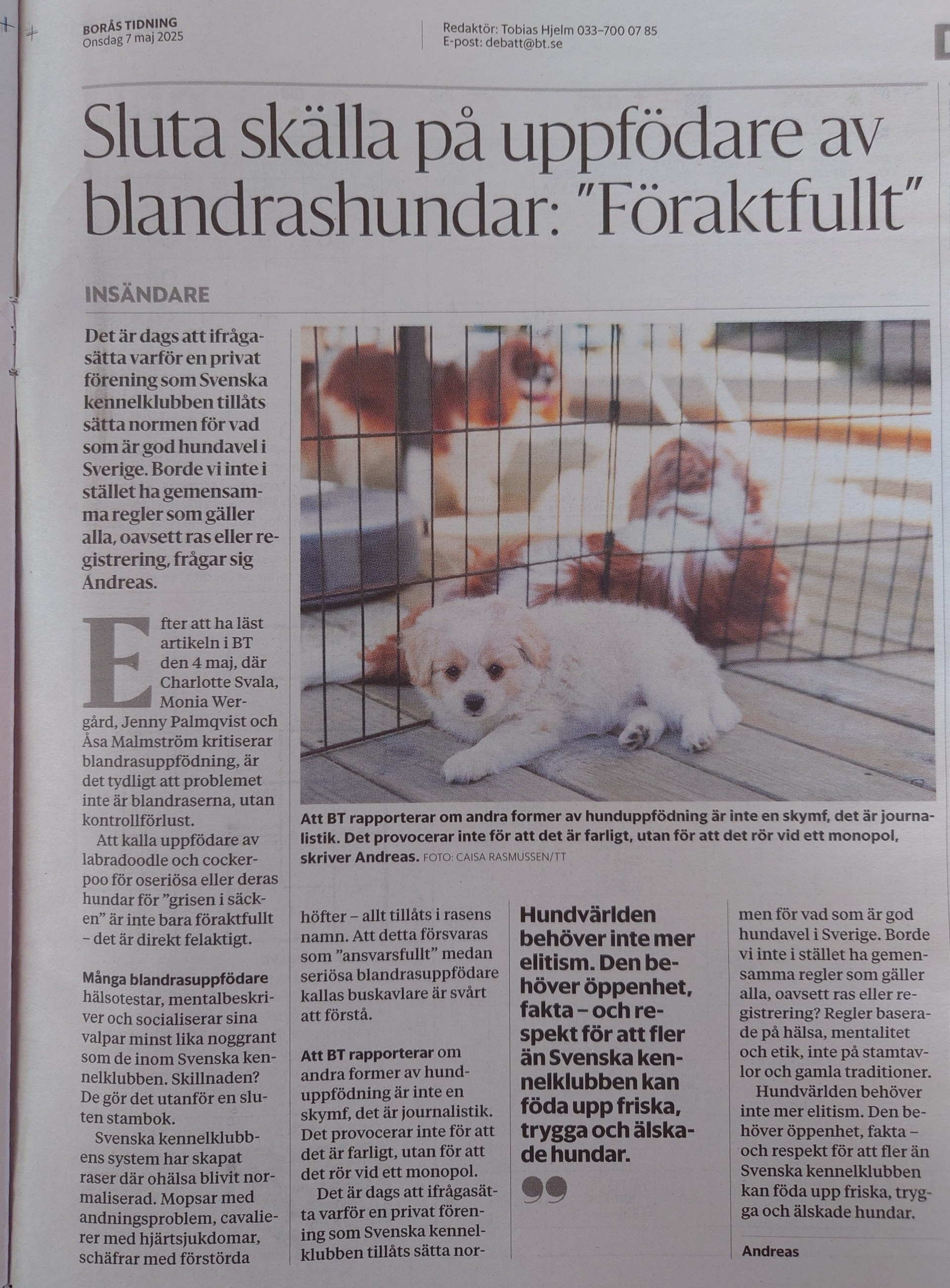Situationen började med en artikel i Borås Tidningen, där en mor och dotter berättade om sitt arbete med att föda upp så kallade designraser, nämligen hundar som är en blandning mellan olika rena raser. I detta fall handlade det om labradoodles (en korsning mellan labrador och pudel) och cockerpoos (en korsning mellan cocker spaniel och pudel). Artikeln var skriven på ett trevligt och positivt sätt, vilket kan ha gett ett intryck av att detta är ett helt acceptabelt och till och med värdefullt sätt att föda upp hundar.