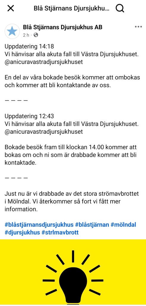 Det omfattande elavbrottet i Mölndal har lett till att verksamheten vid Djursjukhuset Blå Stjärnan för närvarande är helt nedstängd. Just nu uppmanas djurägare att i akuta fall söka sig till Västra Djursjukhuset.