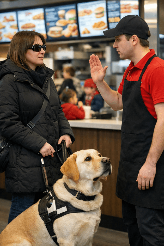 En person med synnedsättning besökte en snabbmatsrestaurang i Helsingborg tillsammans med sina barn. Personen hade beställt mat och väntade inne i restaurangen när en anställd kom fram och meddelade att restaurangens ledning ville att hunden skulle lämna lokalen. Personen förklarade att hunden var en ledarhund och ett hjälpmedel, inte ett sällskapsdjur, och att ett krav på att lämna lokalen skulle vara diskriminering. Personen bad också att få prata med chefen – men chefen vägrade träffa dem. Familjen lämnade restaurangen först när maten var klar.