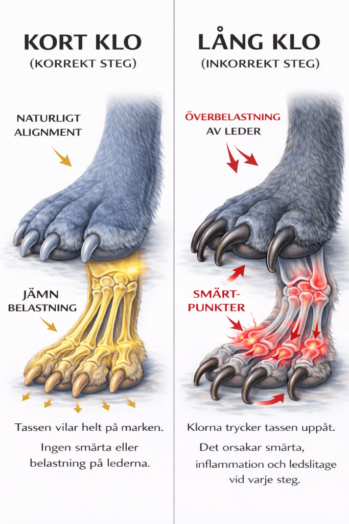 När en hunds klor får växa för långt förändras hela tassens funktion. I stället för att vila plant mot underlaget trycks tårna uppåt av klorna. Detta gör att: